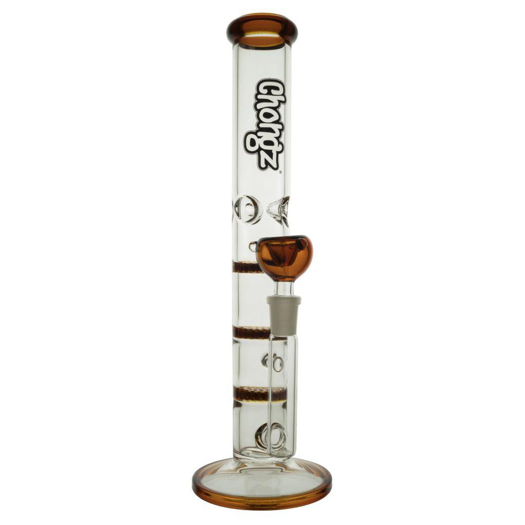 Standing at the height of 30cm tall and constructed from strong 7mm thick borosilicate glass with a mesmerising hypnotic swirled finish that continues through to the cone piece, packing a 60mm diameter mouthpiece. The diffuser stem and ice notches allow for a smoother bong hit whilst the base is stable and ready for action. One of our best selling bongs with great simplistic features makes it easy and reliable to use, day in day out. I have two of these bongs in my home collection. This bong complement any bong collection. Check out our Chongz bongs for sale at ConePiece.com to purchase yours online today. Chongz Bongs